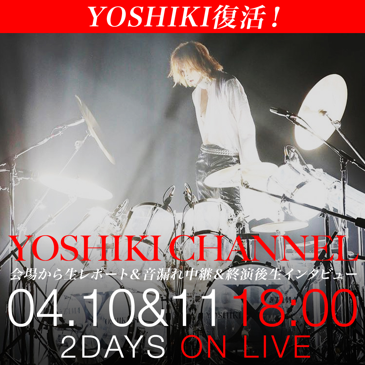 YOSHIKI復活!X JAPAN LIVE 2018~YOSHIKI復活の夜 2DAYS緊急生中継〜会場から生レポート&音漏れ中継&ライブチラ見せ(4/11のみ)終演後生インタビュー +4/11新経済サミットに緊急参戦!